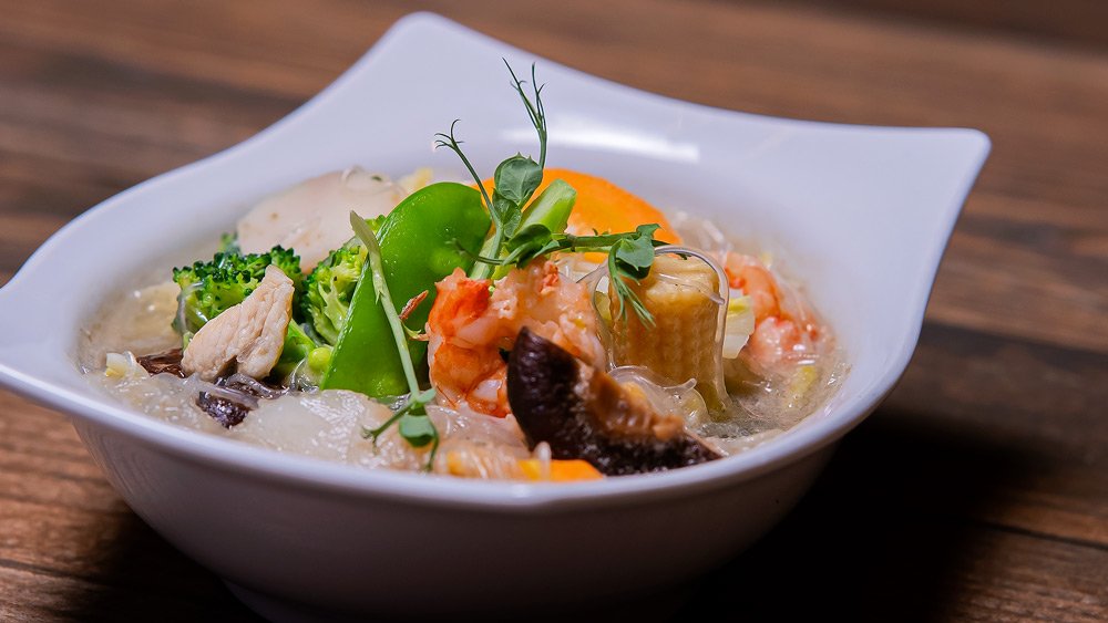 Sopa de verduras, hongo negro, bamboo, castaña, lechuga china, elotito, chícharo, brócoli $170