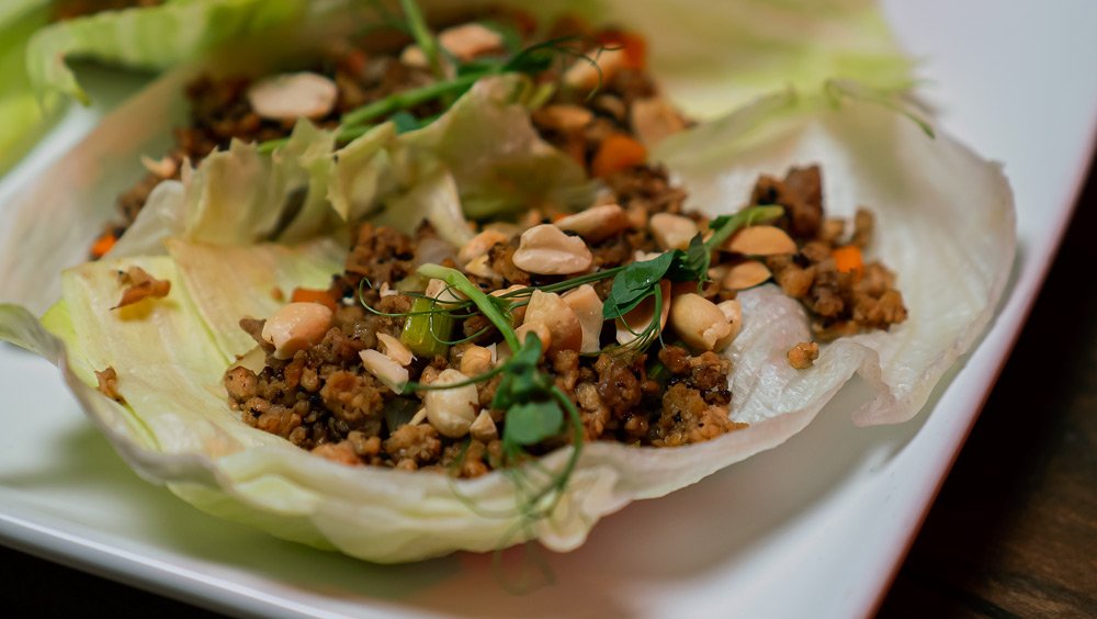 Lomo de cerdo ahumado, pollo, salsa de ostión, salsa de soya, vinagre de arroz, azúcar, sriracha, jengibre, cebolla, ajo, zanahoria, cacahuate, cilantro $195