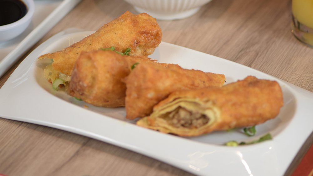 Guiso especial de carne de cerdo ahumado, pollo, castaña de agua, apio, zanahoria envuelto en crepa de huevo y dorado en fina harina preparada $175